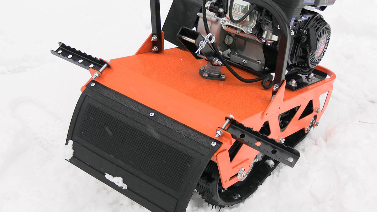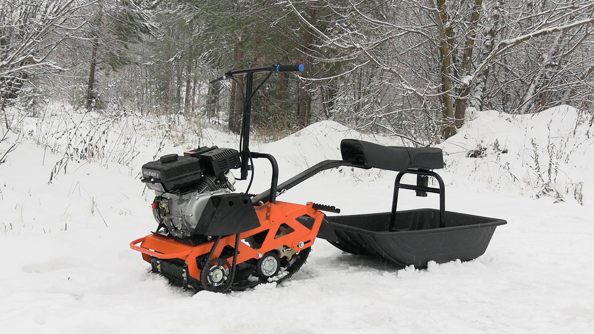 Это самые бюджетные буксировщики ценой до 40 тысяч рублей. Они интересны тем, что супер компактные и быстро разбираются на быстросъемных соединениях. Такие буксировщики имеют маленькую гусеницу. Она представляет собой ? от гусеницы снегохода буран, ширина такой гусеницы 380мм, а длина, примерно, 1200мм. Это самая маленькая гусеница