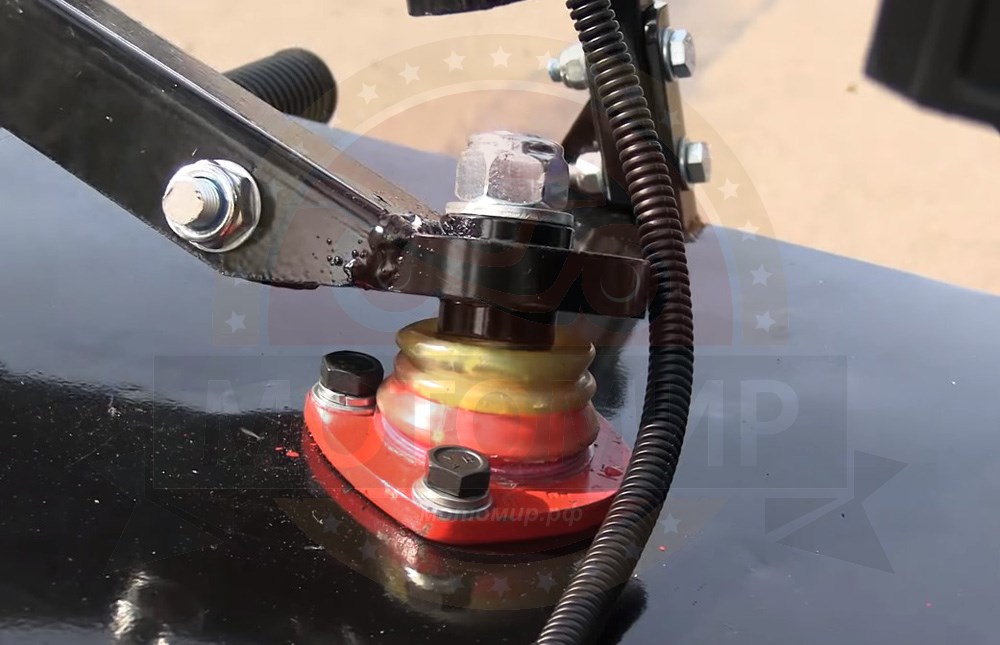 На всех буксировщиках серии Лидер установлен дисковый механический тормоз. Он предназначен не только для непосредственного торможения буксировщика, но и для более комфортного переключения коробки реверса, аналогично снегоходу Буран.
