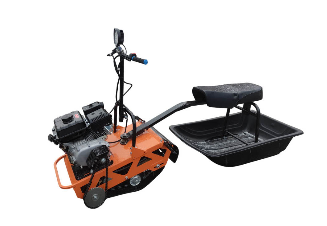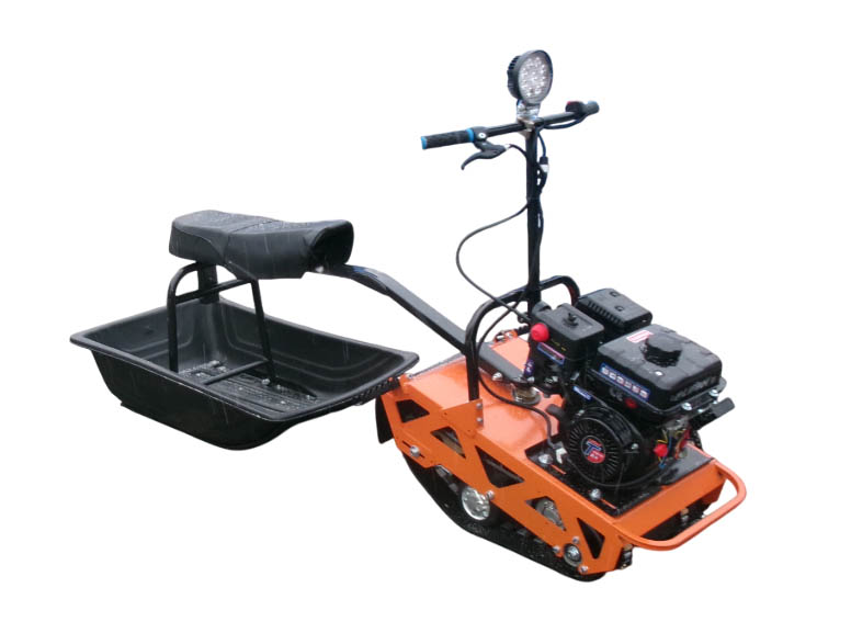 Это самые бюджетные буксировщики ценой до 40 тысяч рублей. Они интересны тем, что супер компактные и быстро разбираются на быстросъемных соединениях. Такие буксировщики имеют маленькую гусеницу. Она представляет собой ? от гусеницы снегохода буран, ширина такой гусеницы 380мм, а длина, примерно, 1200мм. Это самая маленькая гусеница