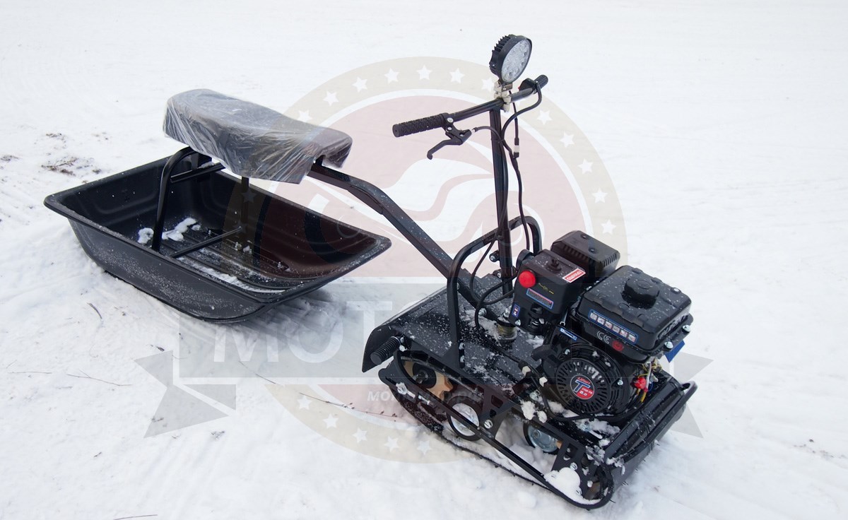 Это самые бюджетные буксировщики ценой до 40 тысяч рублей. Они интересны тем, что супер компактные и быстро разбираются на быстросъемных соединениях. Такие буксировщики имеют маленькую гусеницу. Она представляет собой ? от гусеницы снегохода буран, ширина такой гусеницы 380мм, а длина, примерно, 1200мм. Это самая маленькая гусеница
