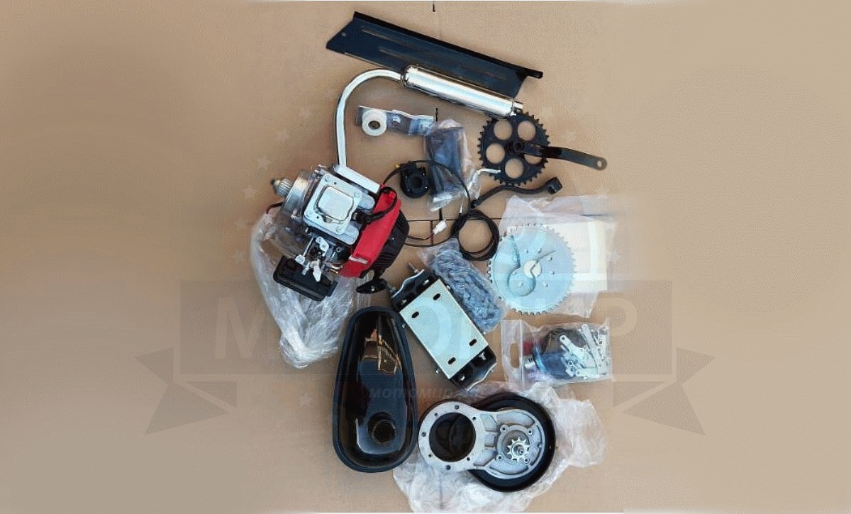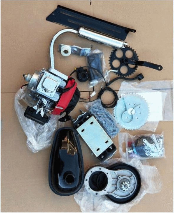 За 6 тысяч можно купить полный комплект и там будет всё необходимое: Веломотор, система питания (карбюратор), выхлоп (глушитель), бензобак, соответствующие крепления на раму, трансмиссия, задняя звезда, цепочка, все крепления для установки задней звезды на заднее колесо, все необходимые метизы.